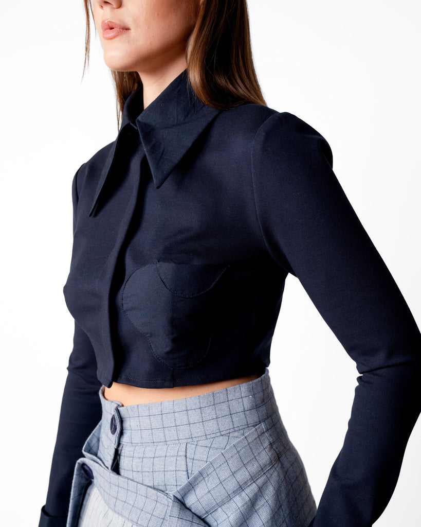 يمزج توب بيازا بين التصميم المنظم والمرونة الناعمة، ليعكس سحر فلورنسا المفتوحة. مصنوع من مزيج من قطن البوبلين الناعم وقطن الجيرسيه المرن، ليمنحكِ الدقة والراحة. يتميز بياقة مدببة مبالغ فيها، وجيب بتصميم منحوت، وتصميم قصير يناسب البناطيل أو التنانير عالية الخصر.
